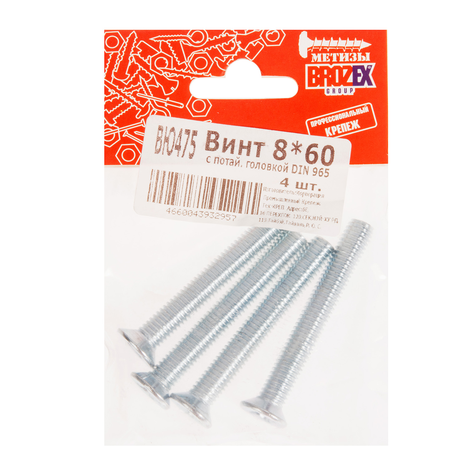 Винт с потайной головкой DIN965 8х60 (4шт) пакет BROZEX *10/100