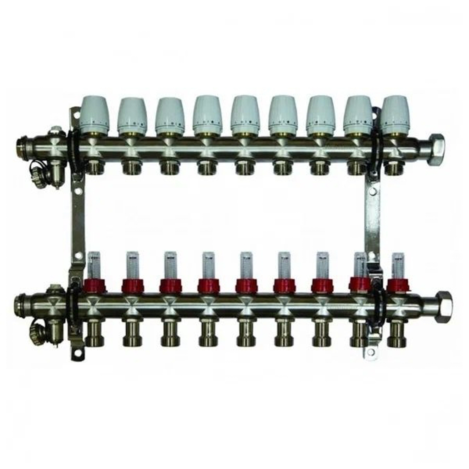 Коллекторная группа Millennium с расходомерами выполнена из нержавеющей стали, имеет регулировочные и термостатические вентили. Применяется при монтаже радиаторного отопления и теплых полов.