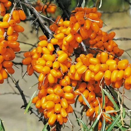 Плоды насыщенно-оранжевого окраса, вытянутые около 1 см, вес плодов 1 г, с сочным, кисло-сладким терпким вкусом, с большим количеством витаминов. Высаживают на солнечном месте, на песчаной почве, где нет сквозняков. Морозостойкость высокая, подойдет для любого региона России.