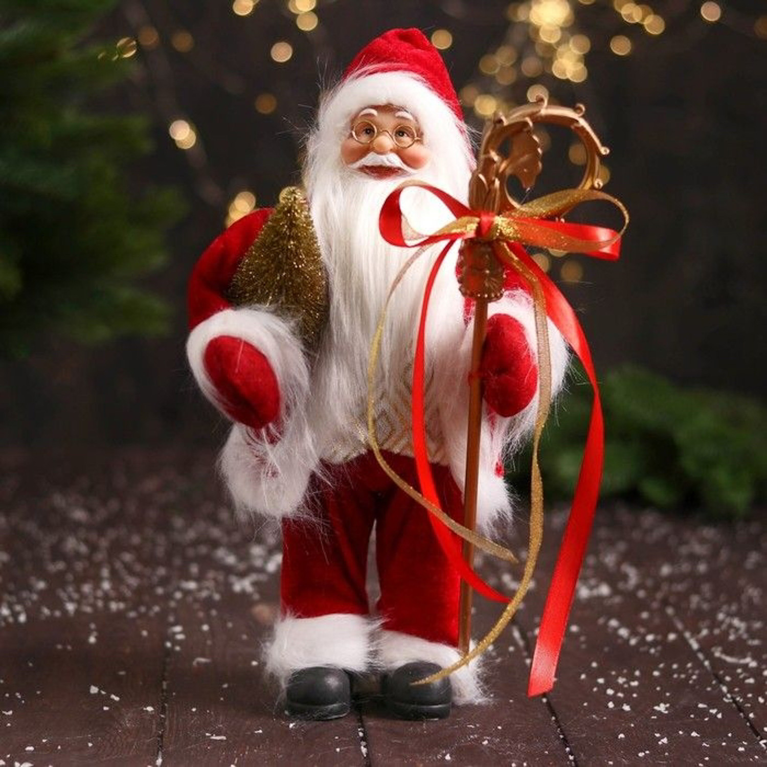 Дед Мороз " В кафтане с мехом и узорным посохом" 30 см, бело-красный 7856776
